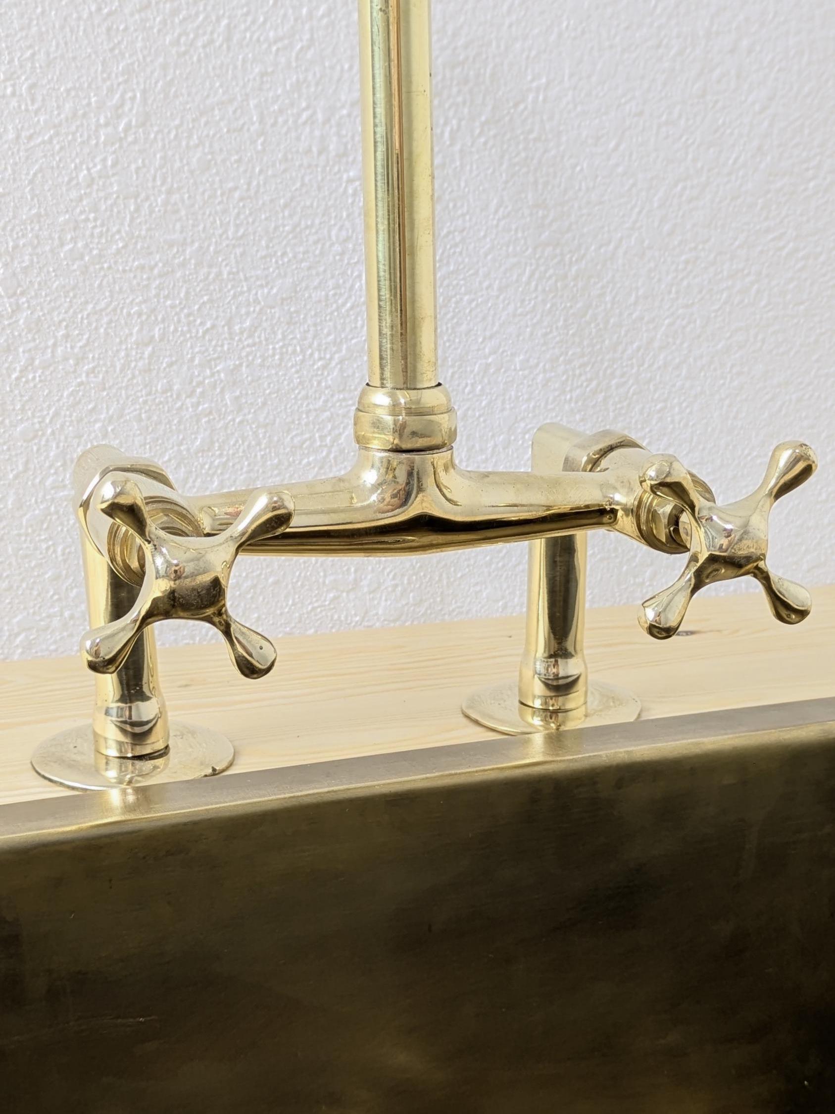 ↪ This Unlacquered solid brass bridge faucet has a simple and clean design that works well in kitchen sinks. The neutral design fits in with any decor, and you can choose between cross or flat handles to make it unique.