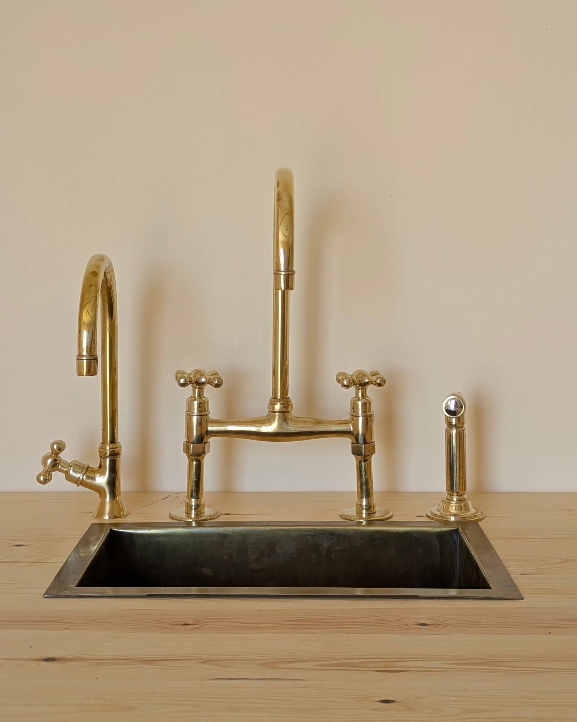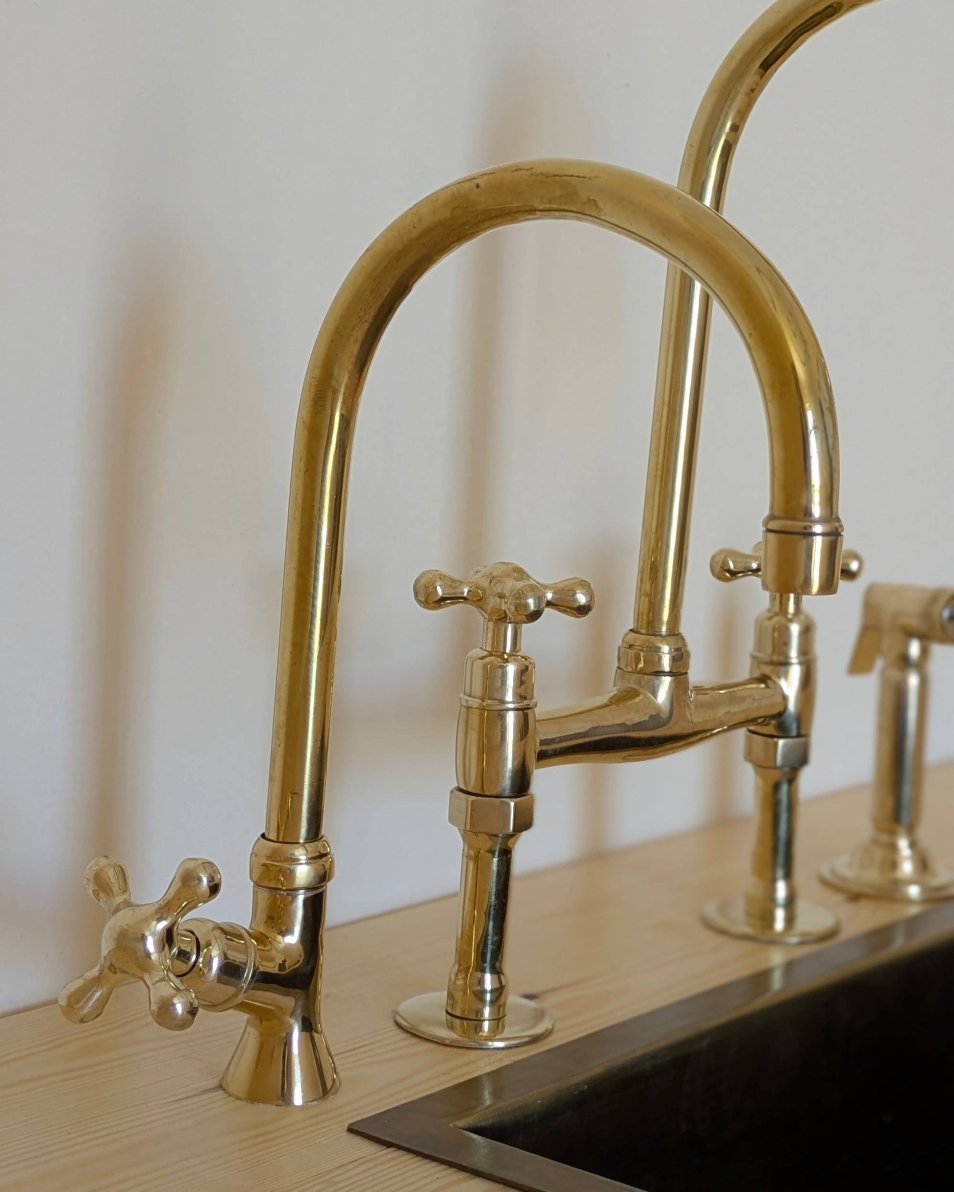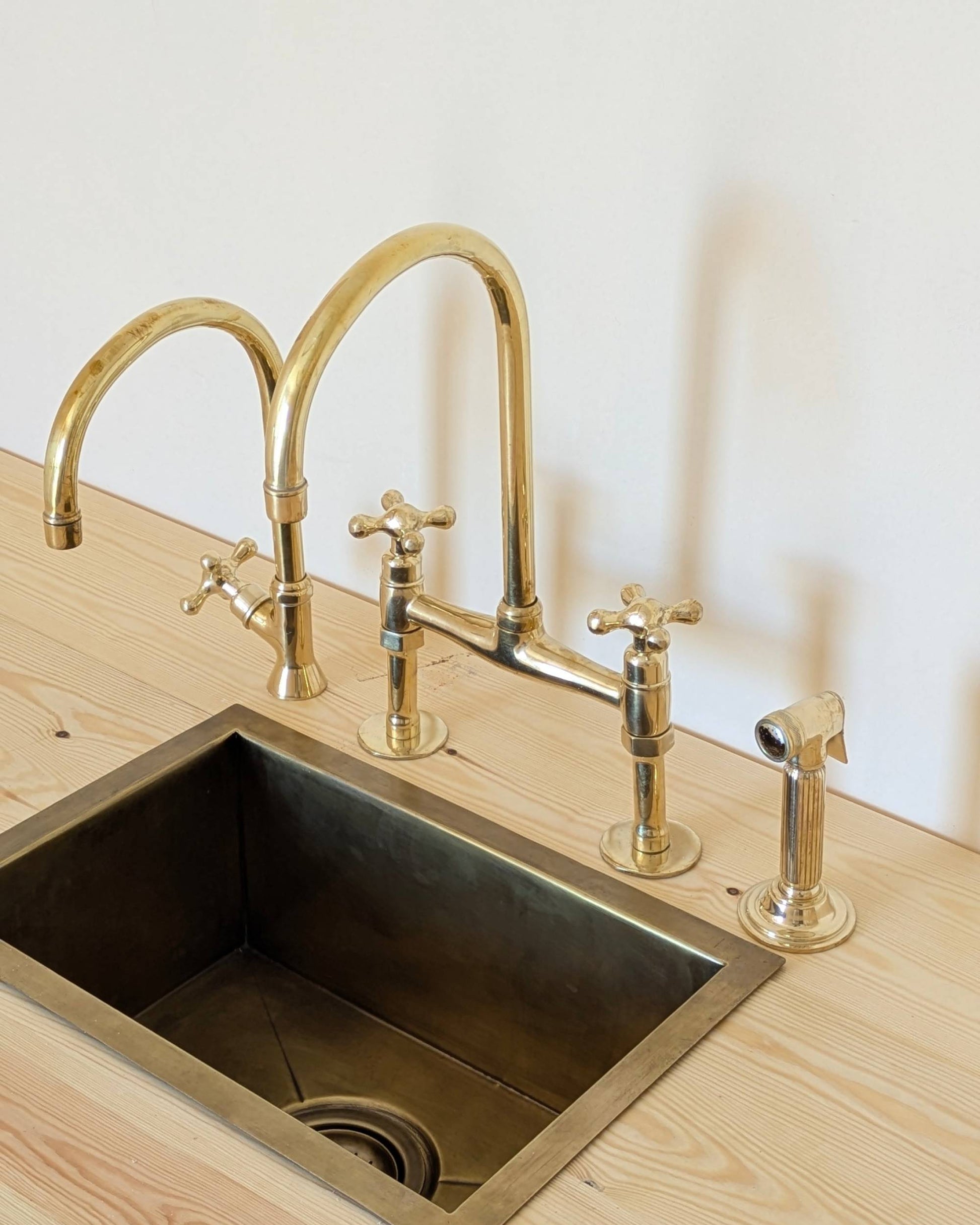 Unlacquered Brass Bridge Faucet With a Side Sprayer and a Separate Cold Water Faucet.