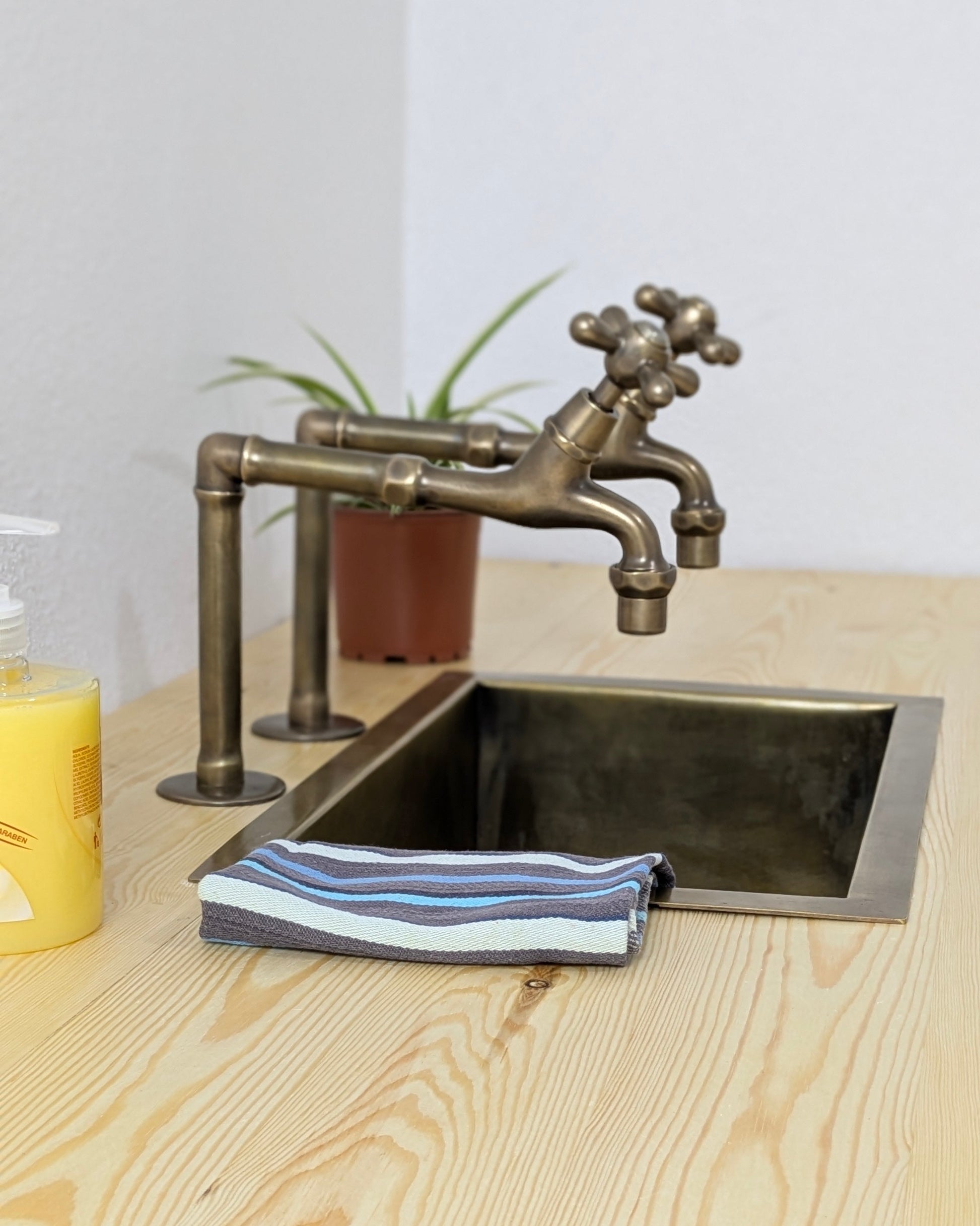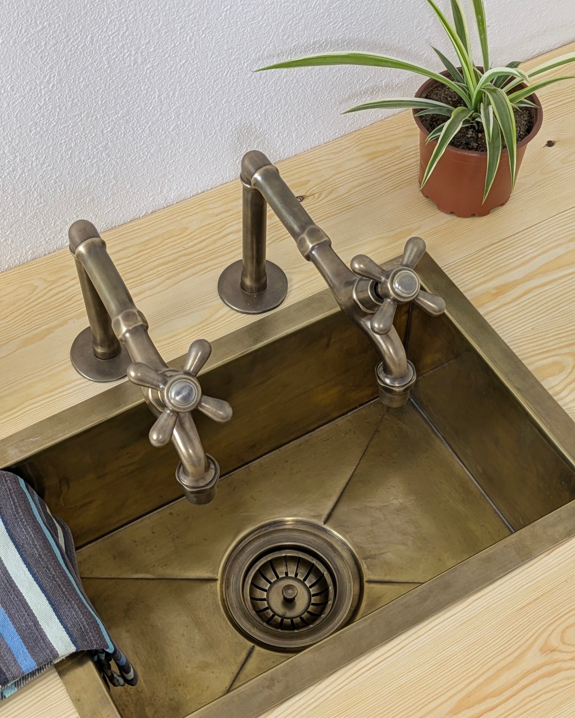 Vintage Brushed Brass Pillar Kitchen Faucet – Separate Handles For Hot & Cold Water.